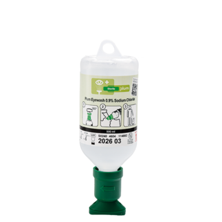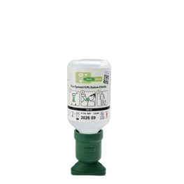 Bottle with a 0.9% sterile sodium chloride solution. The bottle is usable for refilling stations or alone.